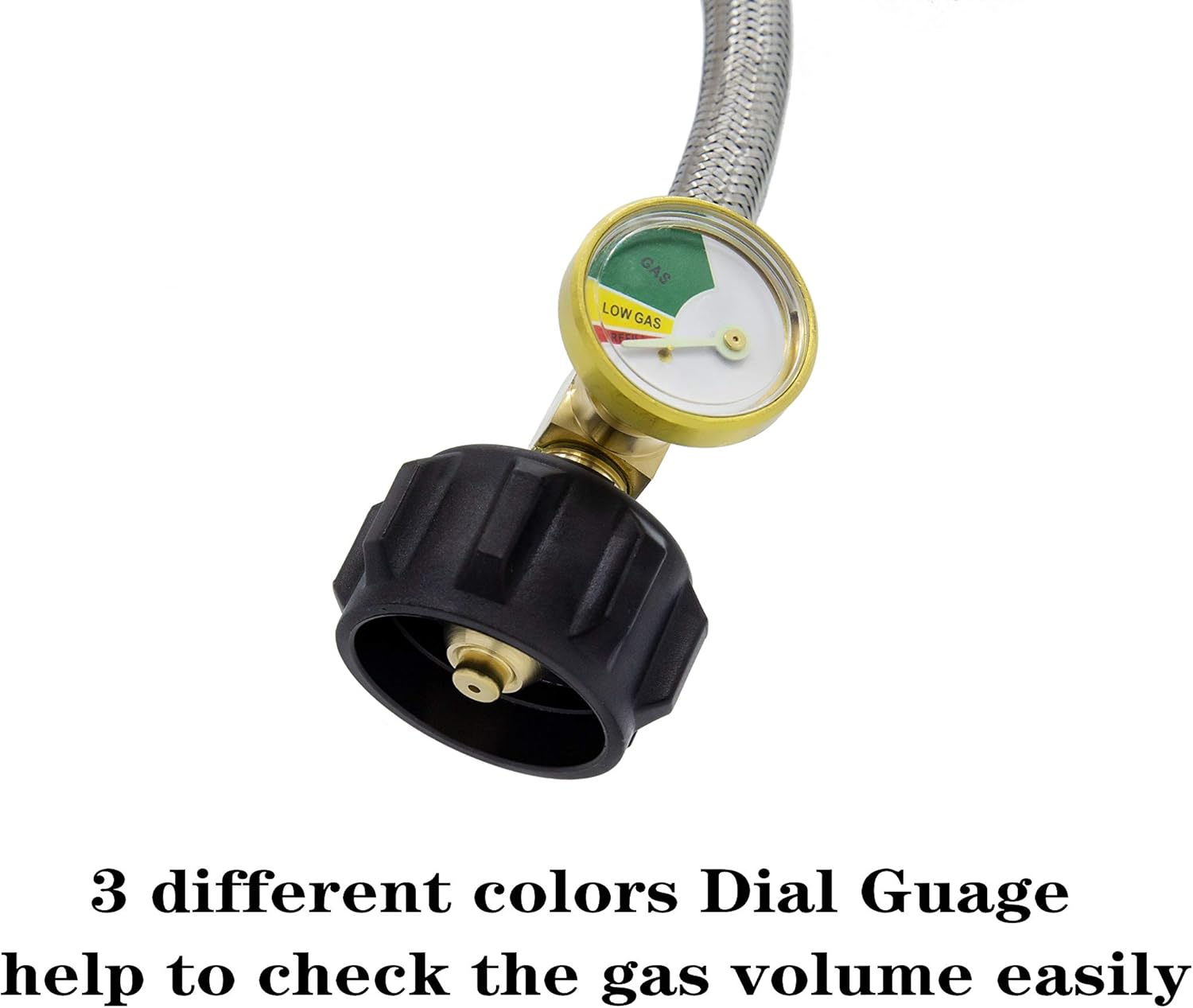 The 1/4" NPT RV Propane hose with color coded dial guage allows you to check the gas volume easily.The solid brass fitting provide secure, airtight connection propane equipment and the protective sleeves provide a highly resistant seal on pipe threads for each services.