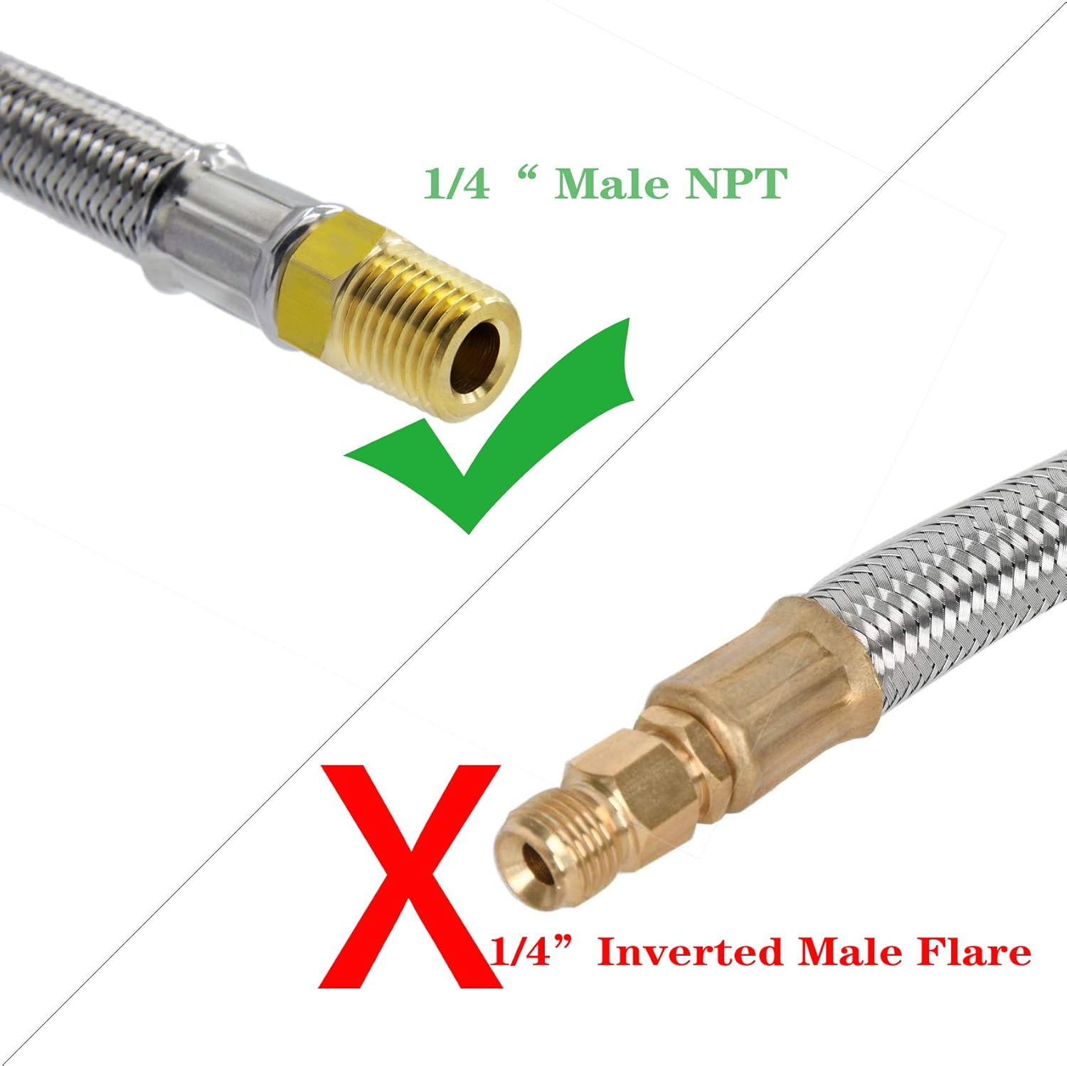 1/4" male NPT stainless steel braided pigtail hose is fit for 1/4" female NPT. It's NOT 1/4" INVERTED MALE FLARE.Please check your connector before ordering.