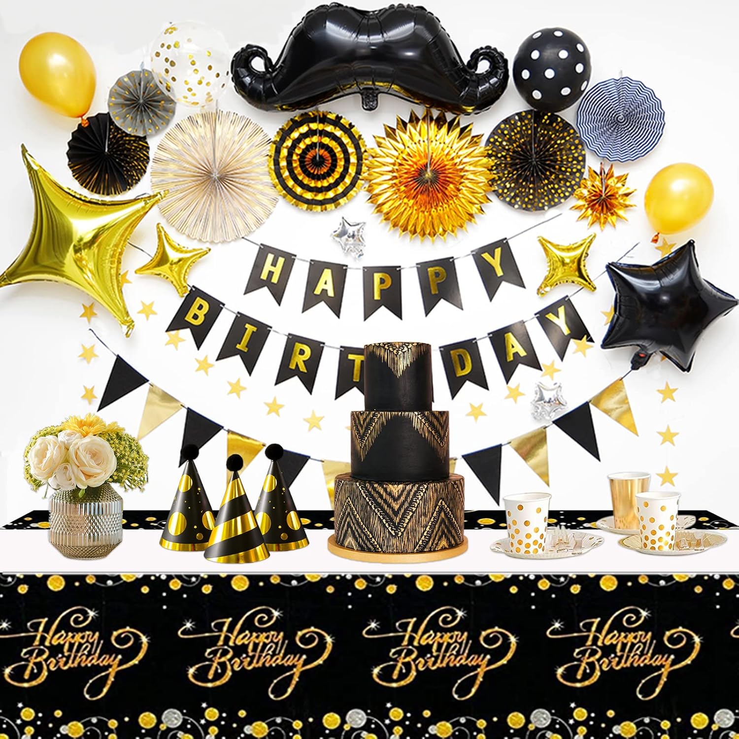 Black and Gold Party Supplies - Happy Birthday Party Table Cloth, Plastic Disposable Table Cover for Men Women Party Birthday Party Decoration, 52"X 90", 2 Pack (Promotion Code: 20K38Y4U)