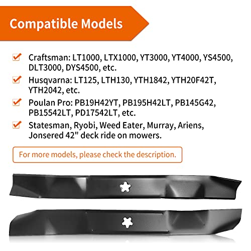 - 【Compatible Models】Lawn mower blades are ideal for ① Craftsman: LT1000, LT2000, YT3000, YT4000, YS4500, etc. ② Hu sqvarna: LT125, LTH130, YTH1842, YTH20F42T, YTH2042, etc. ③ Poulan Pro: PB19H42YT, PB195H42LT, PB145G42, PB15542LT, PD17542LT, etc. ④ Statesman, Ryobi, Weed Eater, Murray, Jonsered, A riens Arians 42" deck ride on mowers. For more models, please check the description.