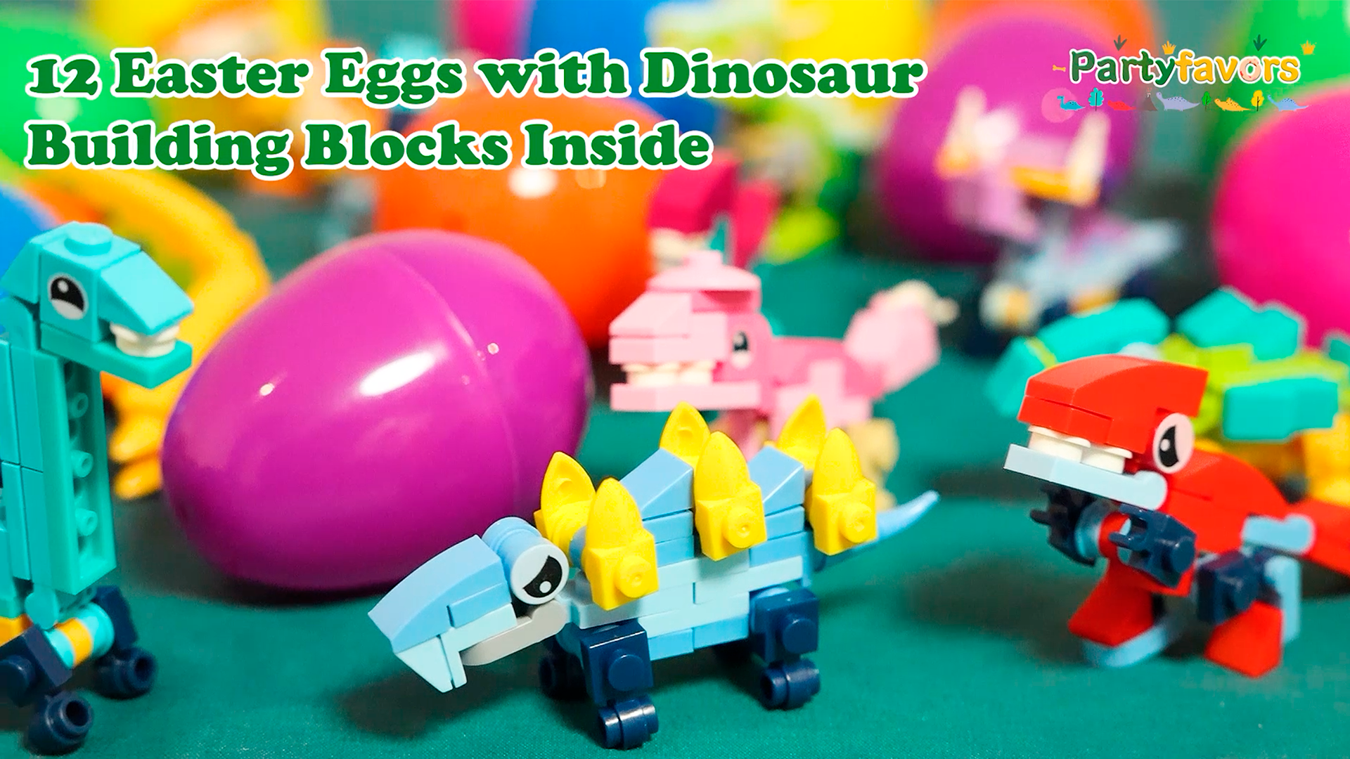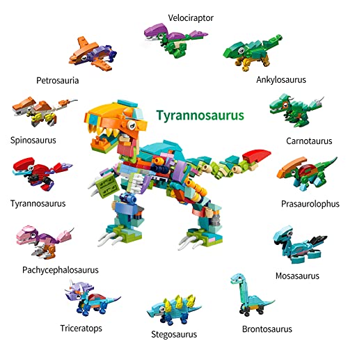 - Dinosaur Building Blocks: The Easter Eggs has 12 different kinds of dinosaurs including Ankylosaurus, Velociraptor, Spinosaurus, Carnotaurus, Pachycephalosaurus, Triceratops, Brontosaurus, Petrosauria, Mosasaurus, Stegosaurus, Parasaurolophus, Tyrannosaurus. Also, All the building blocks can be put together into a large Tyrannosaurus.