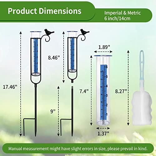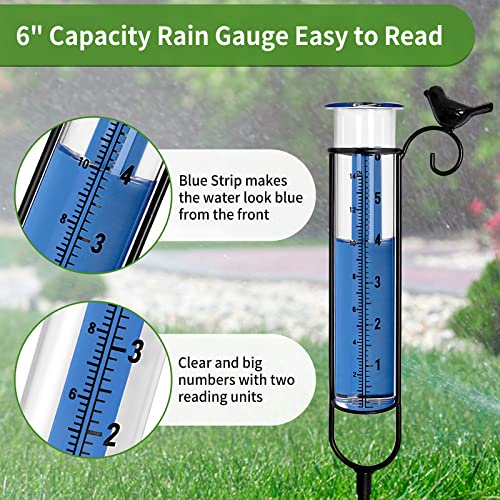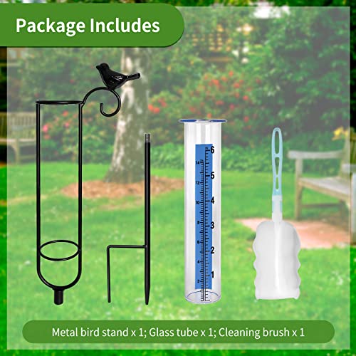 Jowlawn 6" Capacity Rain Gauge Outdoor, Detachable Glass Rain Gauges with L-Shaped Metal Stake - Cast Iron Bird Rain Gage with Tube Brush, Water Rain Meter for Yard, Lawn, Garden, Fence Decoration