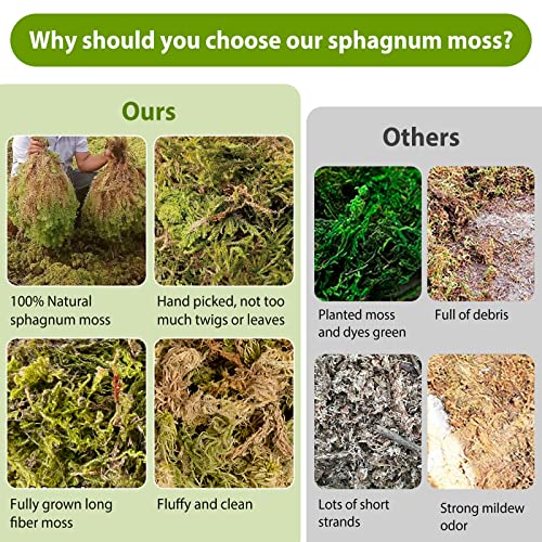 - 【Natural Sphagnum Moss】 Dried sphagnum moss is hand picked, just mixed with a small number of sticks and leaves. Long strands of moss comes from sustainable swamps and wetlands, processed by naturally air dried, fluffy and clean, without any artificial colouring.