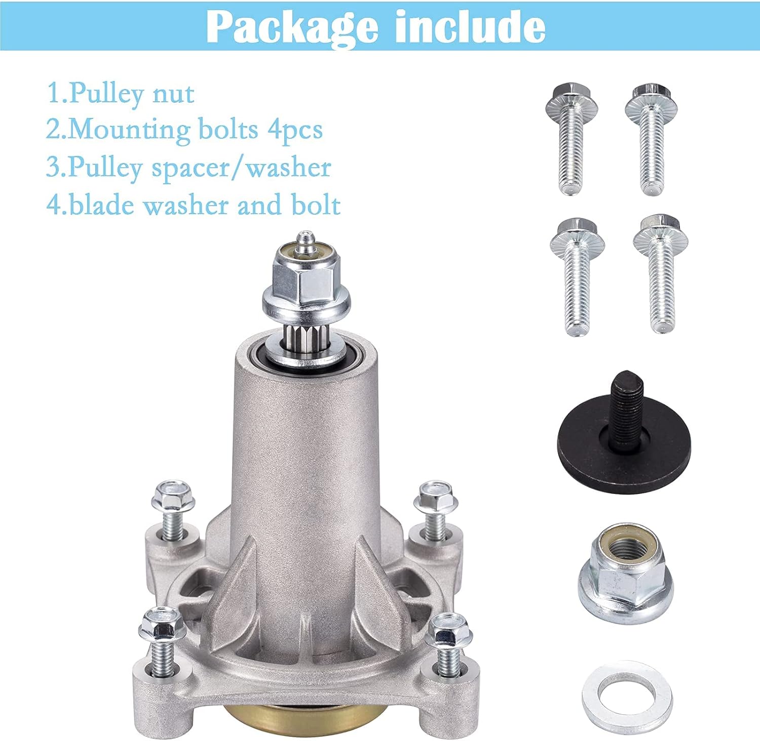 Easy to install with 4 THREADED mounting bolts (the mounting holes are also already threaded), pulley nut, blade bolt & washer. Make your installation much easier.